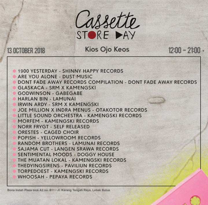 Tahun ini, Cassette Store Day yang di Jakarta, diadakan di Kios Ojo Keos, Ruko Bona Indah, Lebak Bulus, Jakarta Selatan. Sebuah toko milik band Efek Rumah Kaca, yang memang sangat aktif mengadakan acara didalam tokonya.